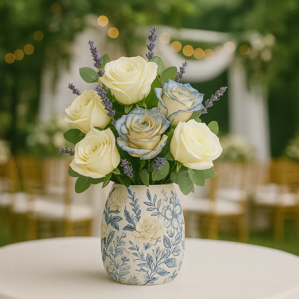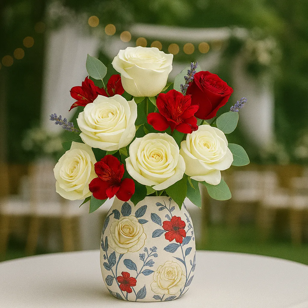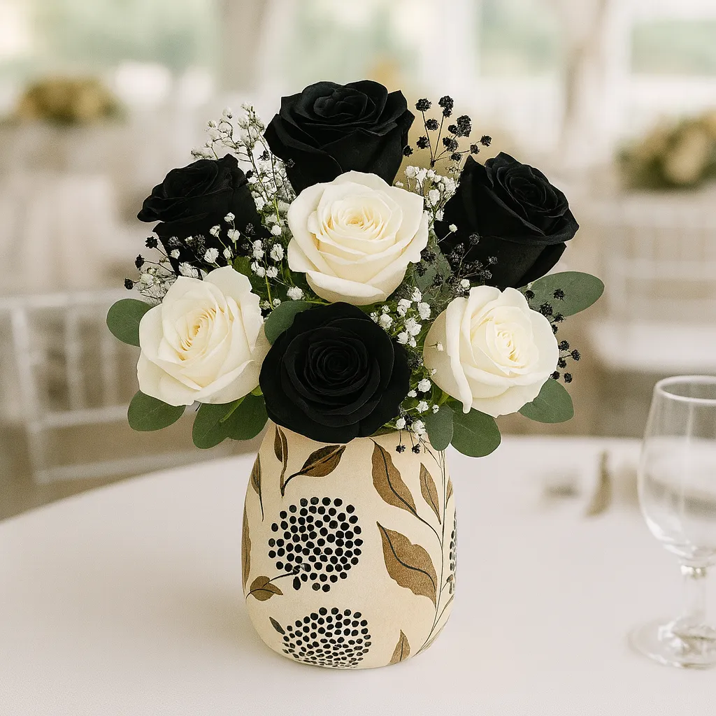 Non Spill Vase arrangements made from Recycled Plastics with Pre-Arranged customizable rose selections & vase designs.